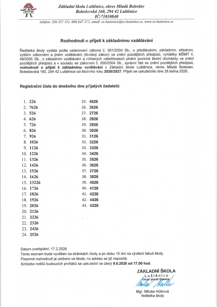 Seznam přijatých žáků bude zveřejněn na stránkách školy a na vývěsce školy. Písemné rozhodnutí o nepřijetí žáka do 1. ročníku bude zákonným zástupcům doručeno v zákonné lhůtě 15 dnů.